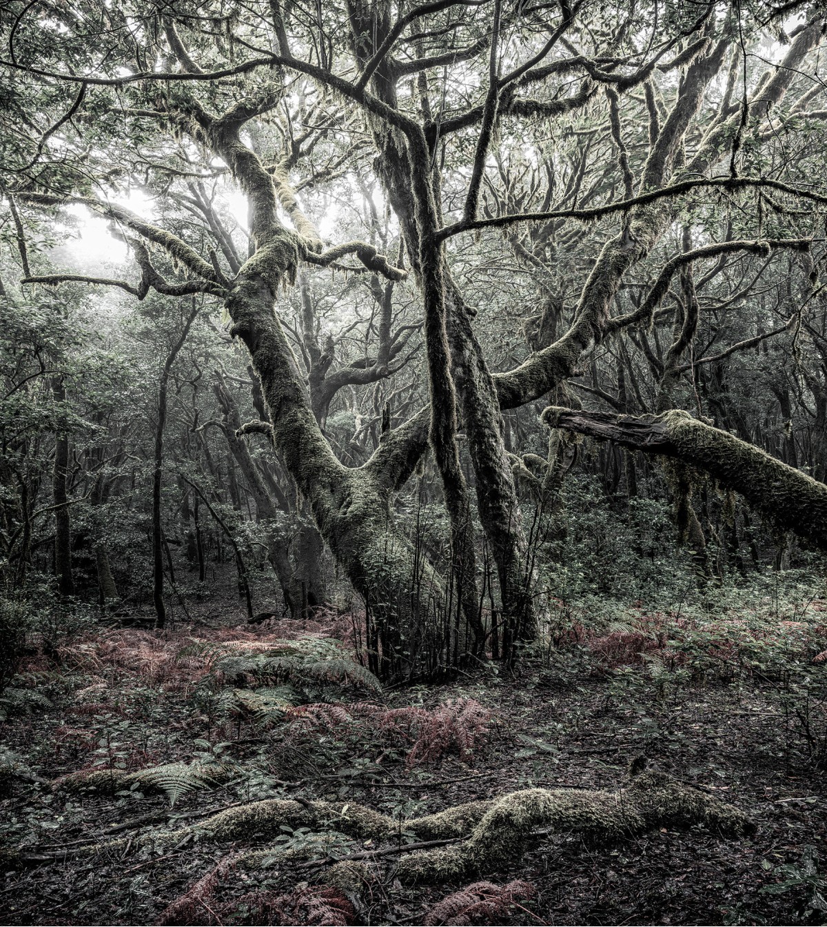 Nationaal park Garajonay op het Spaanse eiland La Gomera is een UNESCO-werelderfgoed dankzij het unieke ecosysteem. Het is de thuisbasis van zulke schatten en natuurlijke schoonheden als deze met mos bedekte laurierboom.