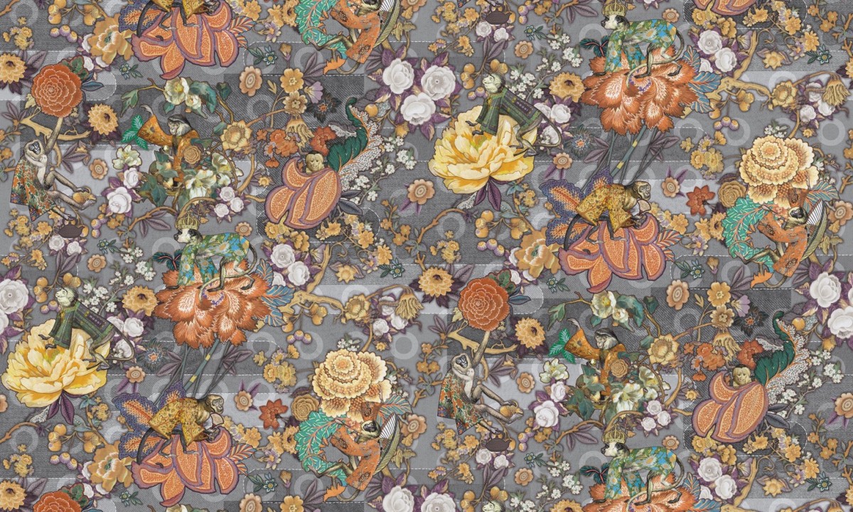 Printed on a soft and velvety finish fabric with denim textures, this lively wallcovering depicts a lush forest brimming with life and movement. Upon closer inspection, Indigo Macaques dressed in traditional kimonos can be discovered between the abundance of exotic flowers.